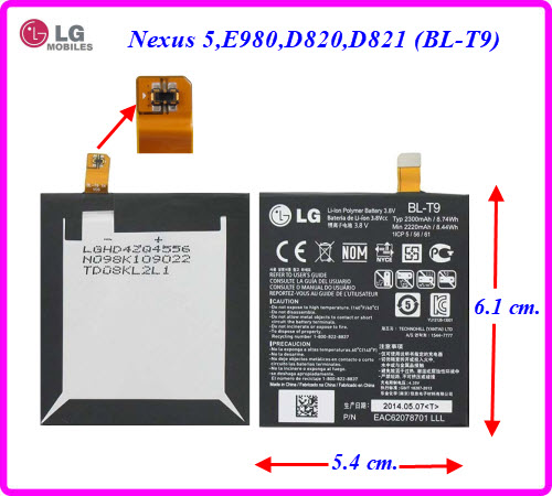 | แบตเตอรี่ LG Nexus 5,E980,D820,D821 (BL-T9) 5.4x6.1 cm. 2300 mAh. |