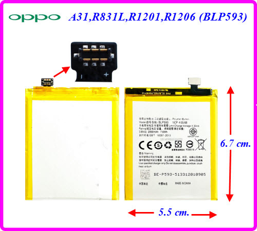 แบตเตอรี่ Oppo A31,R831L,R1201,R1206 (BLP593) 5.5x6.7 cm. 2000 mAh.