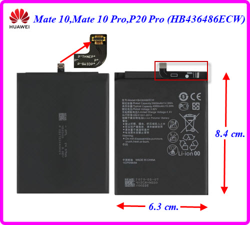 | แบตเตอรี่ Huawei Mate 10,Mate 10 Pro,Mate 20,P20 Pro (HB436486ECW) 6.3x8.4 cm. 4000 mAh. |