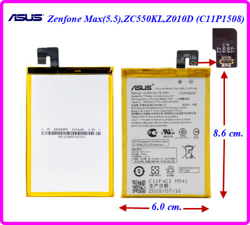 - แบตเตอรี่ Asus Zenfone Max (5.5),ZC550KL,Z010D,Z010DA,Z010DD (C11P1508) Or. 6.0x8.6 cm. 5000 mAh.