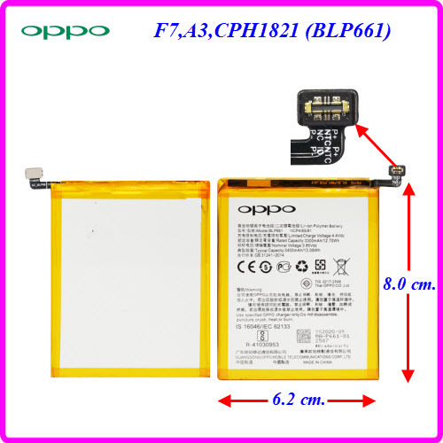 แบตเตอรี่ Oppo F7,A3,CPH1821 (BLP661) Or. 6.2x8.0 cm. 3400 mAh.