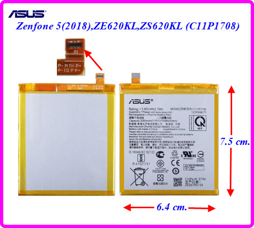 - แบตเตอรี่ Asus Zenfone 5(2018),ZE620KL,ZS620KL (C11P1708) 6.4x7.5 cm. 5000 mAh.