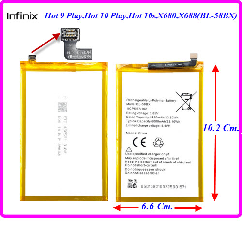 | แบตเตอรี่ infinix Hot 9 Play,Hot 10 Play,Hot 10s,X680,X688(BL-58BX) 6.6x10.2 Cm. |